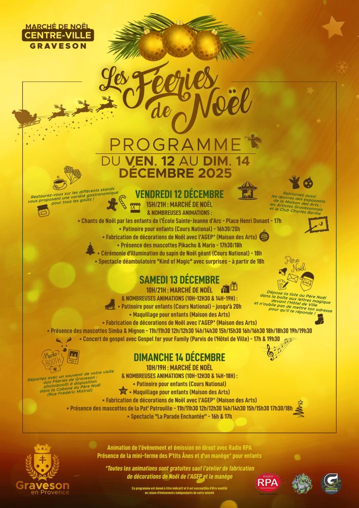 Désormais installés en centre-ville (Cours National, Place Henri Dunant et , Avenue Frédéric Mistral) , 40 exposants vous donnent rendez-vous pour un grand marché piéton à ciel ouvert avec la gastronomie, la décoration et la mode comme thématiques, et avec de nombreuses animations gratuites pour les enfants : patinoire, déambulation féérique, parade, projections sur la façade du Musée Chabaud le soir, Concert de Gospel avec Gospel For You Family, illuminations festives, sapin géant, présence du Père Noël et de ses mascottes, chants de Noël interprétés par les élèves de l'école privée et chalet avec un photobooth pour conserver un souvenir de votre venue aux Fééries …